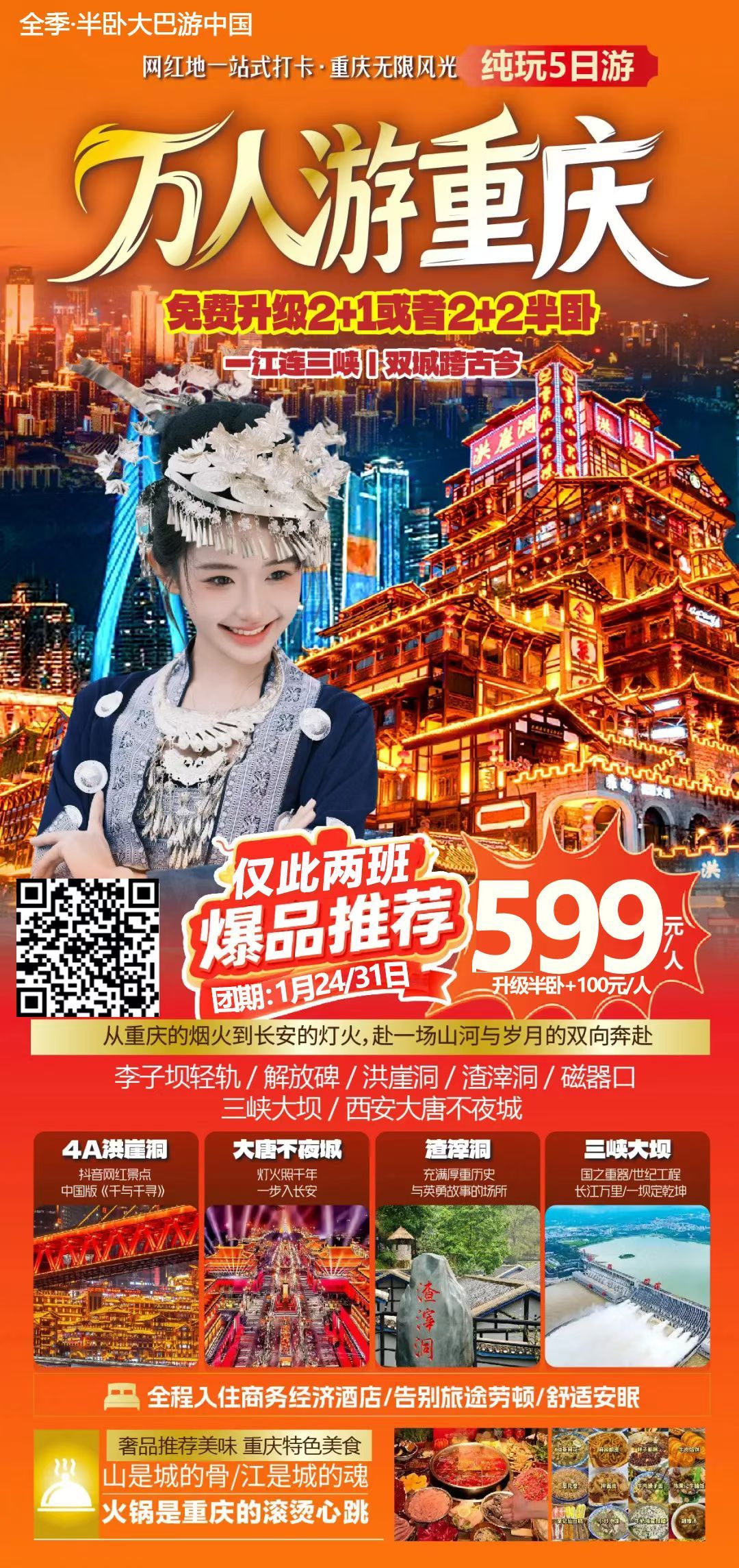 万人游重庆半卧纯玩5日游 2026-1-19 本文被阅读 3 次