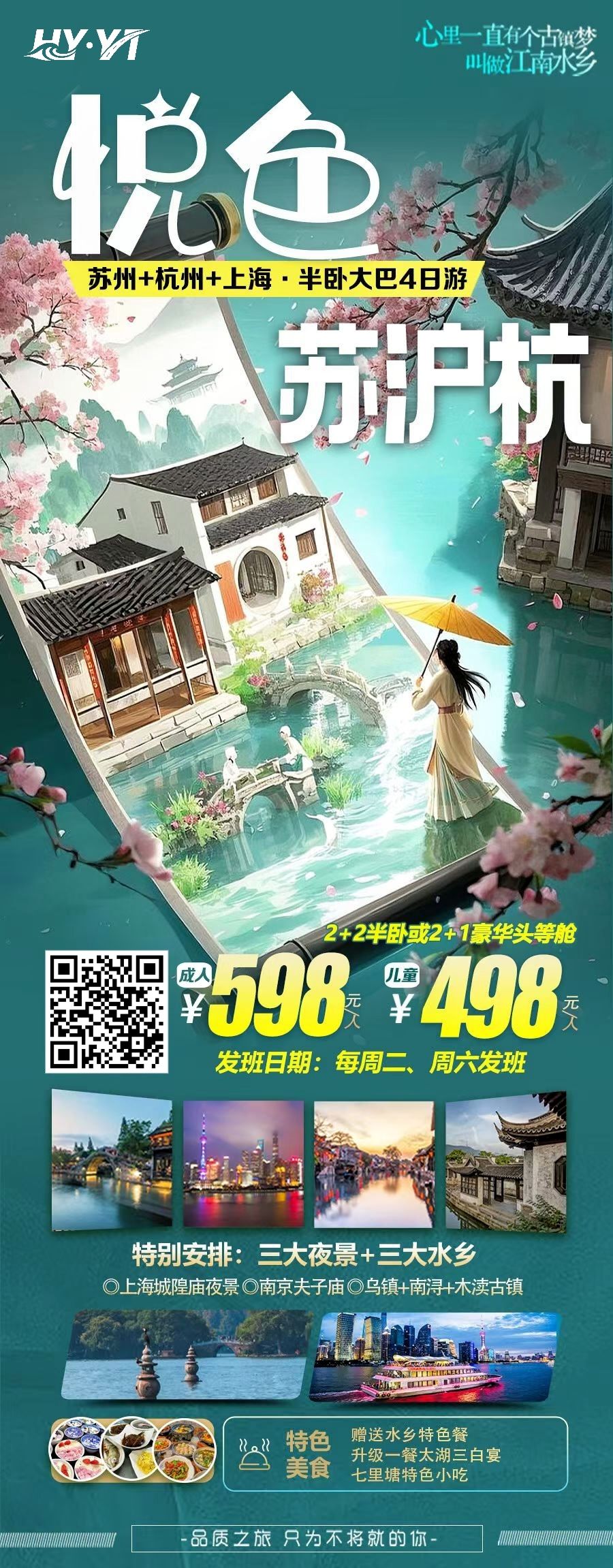 悦色苏沪杭3大水乡华东四市+半卧品质4日游 2026-3-22 本文被阅读 5 次