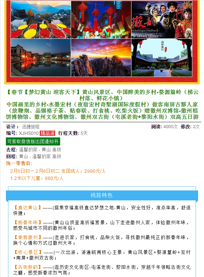 【春节【梦幻黄山 迎客天下】黄山风景区、中国醉美的乡村-婺源篁岭(梯云村落、鲜花小镇) 中国画里的乡村-水墨宏村(夜宿宏村奇墅湖国际度假村)做客南屏古黟人家(放鞭炮、品锡格子茶、贴春联、打食桃、吃柴火饭)赠徽州双博馆-徽州糕饼博物馆、徽州文化博物馆、徽州双古街(屯溪老街+黎阳水街)双高五日游