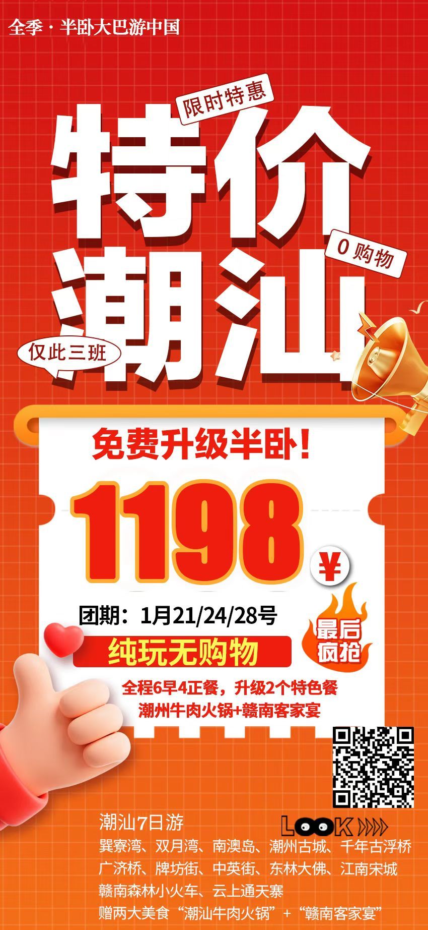 特价潮汕纯玩半卧7日游 2026-1-19 本文被阅读 6 次